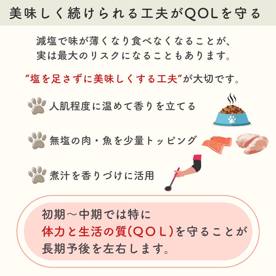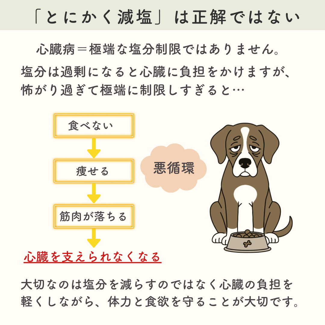 塩分(ナトリウム)は体内の水分量に影響し、過剰になると心臓に負担をかけます。一方で、塩分を怖がりすぎて極端な制限をすると、食事が美味しくなくなり、食べなくなる・痩せてしまうという別の問題が起こりやすくなります。