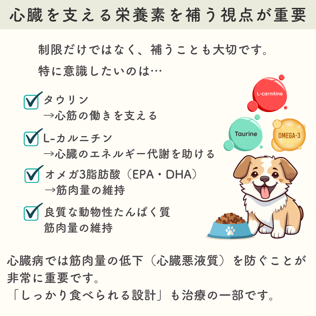 これらが不足すると、心臓のポンプ機能が弱まり、疲れやすくなることがあります。特に筋肉量が落ちやすい心臓病の犬には、意識して摂りたい栄養素です。
