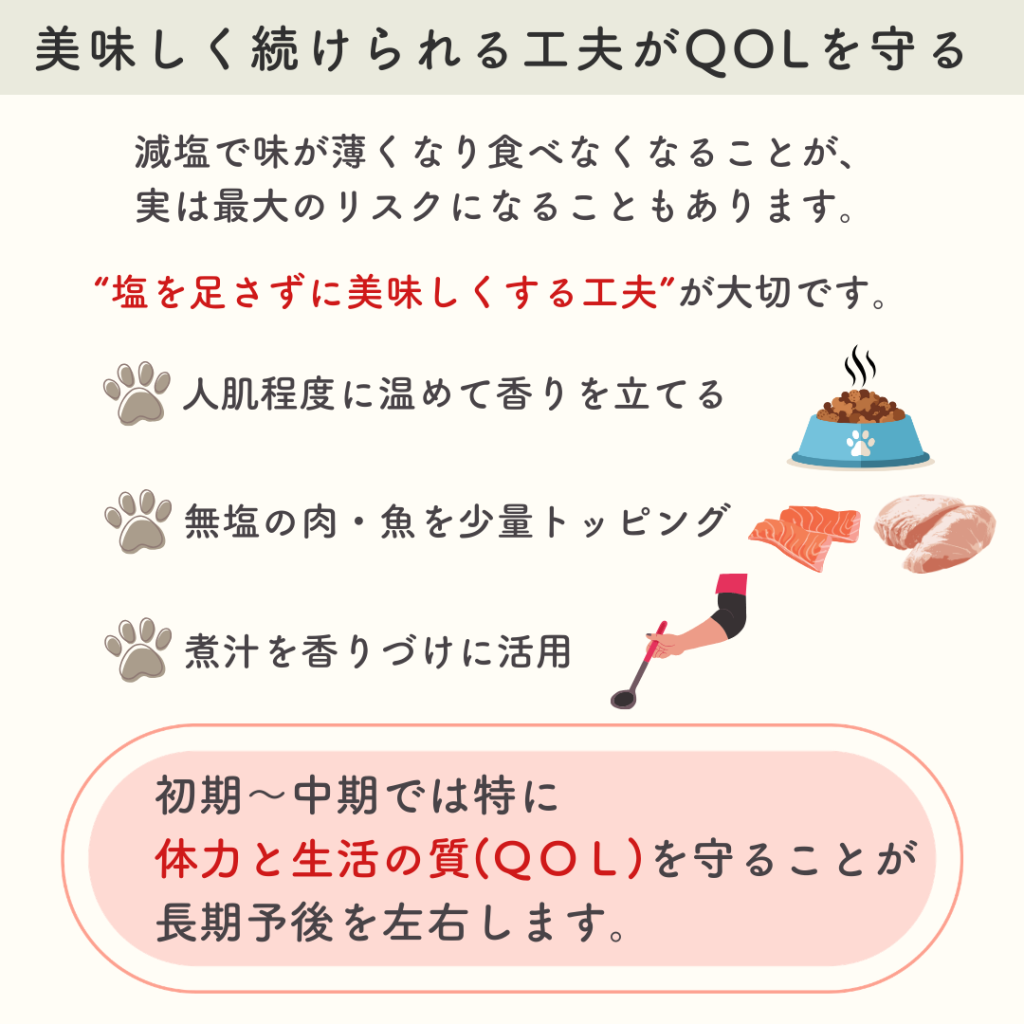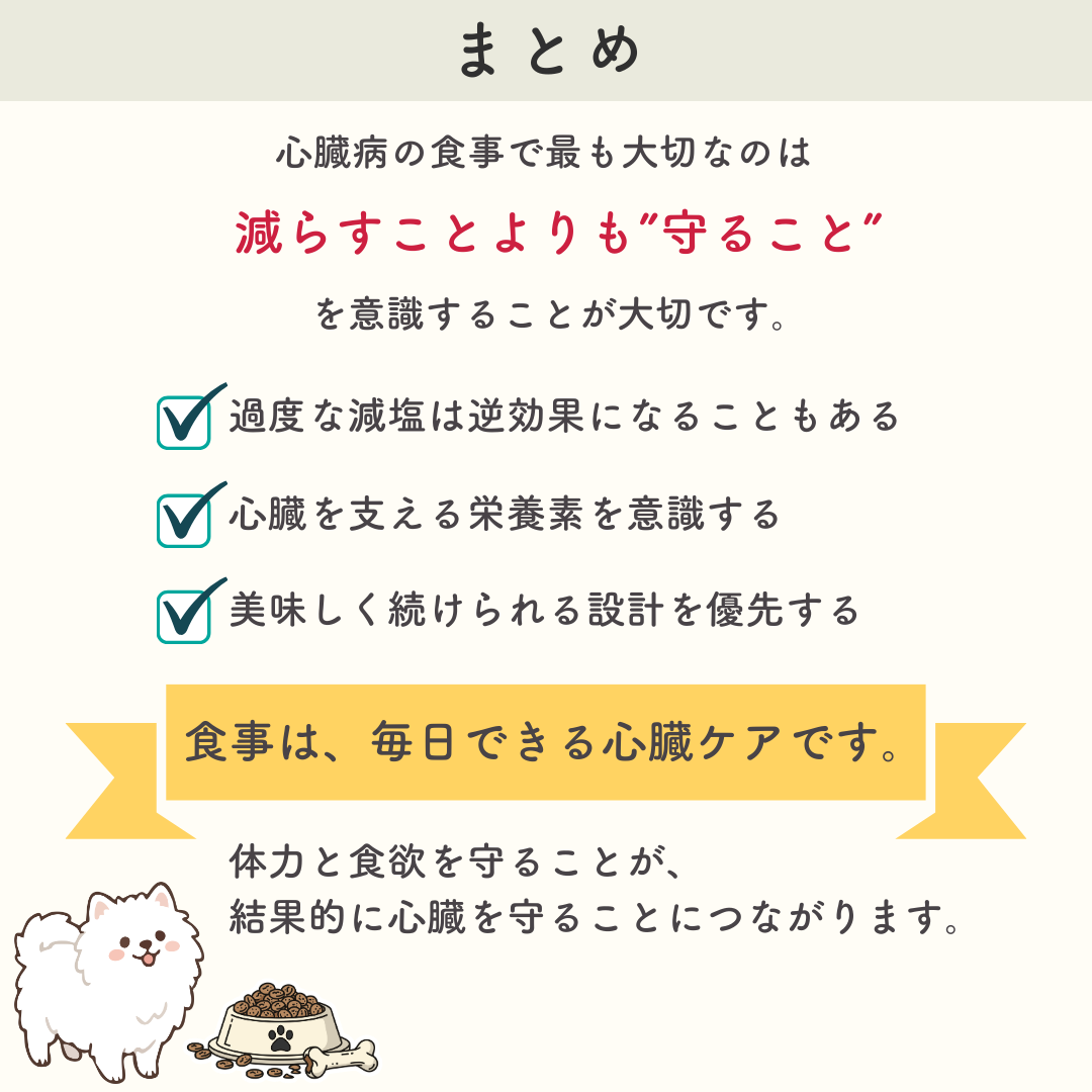 心臓病の食事療法の本当の目的は、塩分を減らすことそのものではなく、心臓の負担を軽くしながら、体力と食欲を維持することにあります。