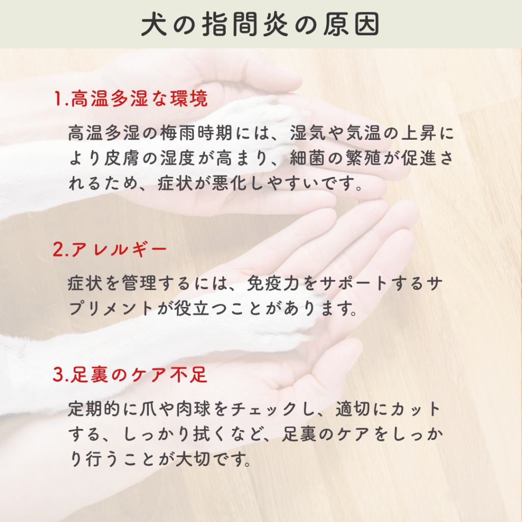 指の間は、犬の体の中でも蒸れやすい場所です。特に、日本の梅雨から夏にかけての高温多湿な環境は、細菌やマラセチアが繁殖しやすくなります。これが、夏場に指間炎が悪化する大きな原因です。雨の日の散歩後などに濡れたまま放置すると、指間炎を発症するリスクが格段に高まります。