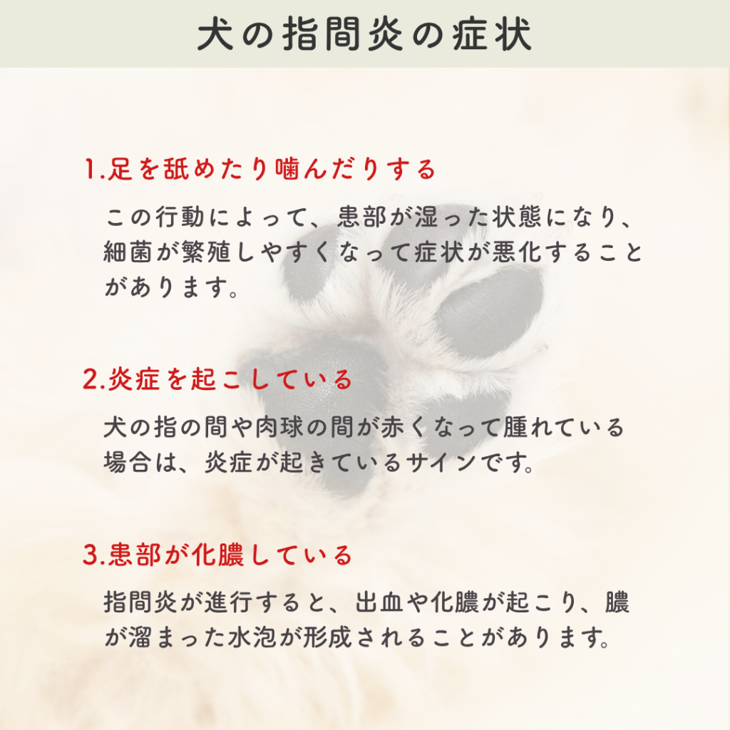 犬の指の間や肉球の間が赤くなって腫れている場合は、炎症が起きているサインです。この炎症により、かゆみや痛みを伴うことが多く、症状が進行すると出血や膿の排出、さらには脱毛が見られることもあります。早めに適切な治療を行うことが大切です。