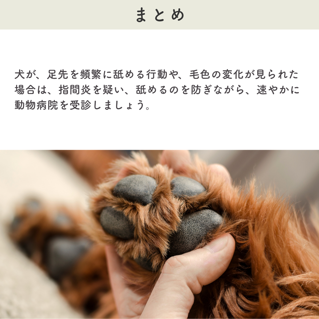 犬の指間炎は、初期症状が目立たないため、発見が遅れることが多い病気です。犬が、足先を頻繁に舐める行動や、毛色の変化が見られた場合は、指間炎を疑い、舐めるのを防ぎながら、速やかに動物病院を受診しましょう。