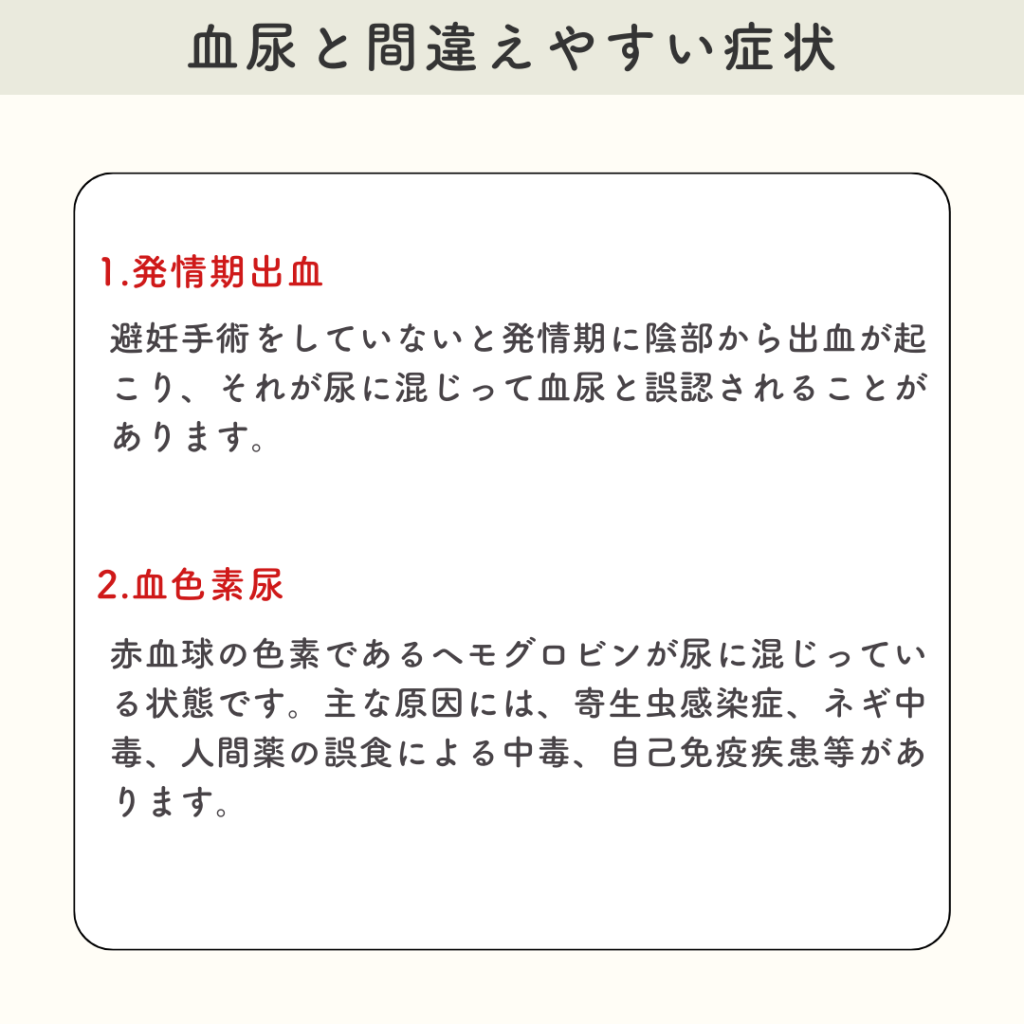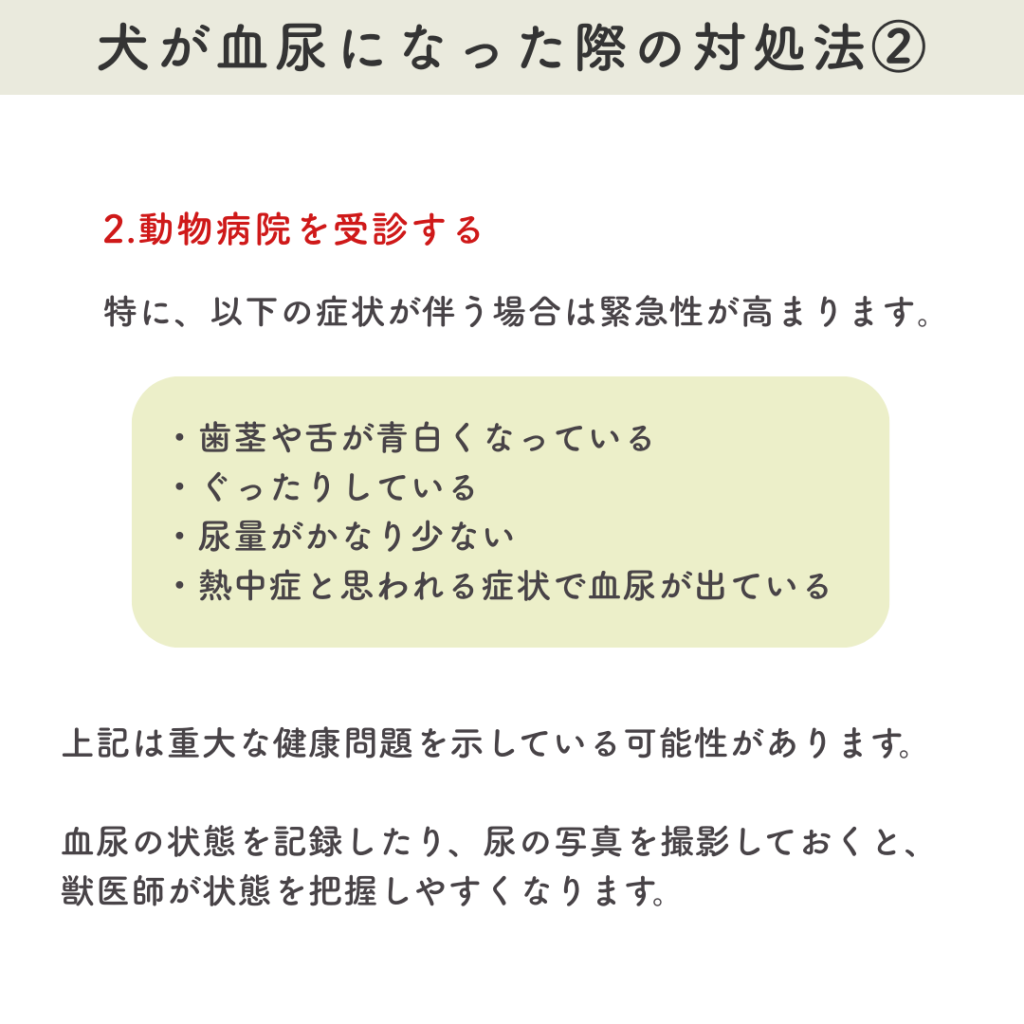 これらの症状は、血尿と合わせて重大な健康問題を示している可能性があります。診察の際には、血尿の状態を記録したり、尿の写真を撮影したりしておくと、獣医師が状態を把握しやすくなります。