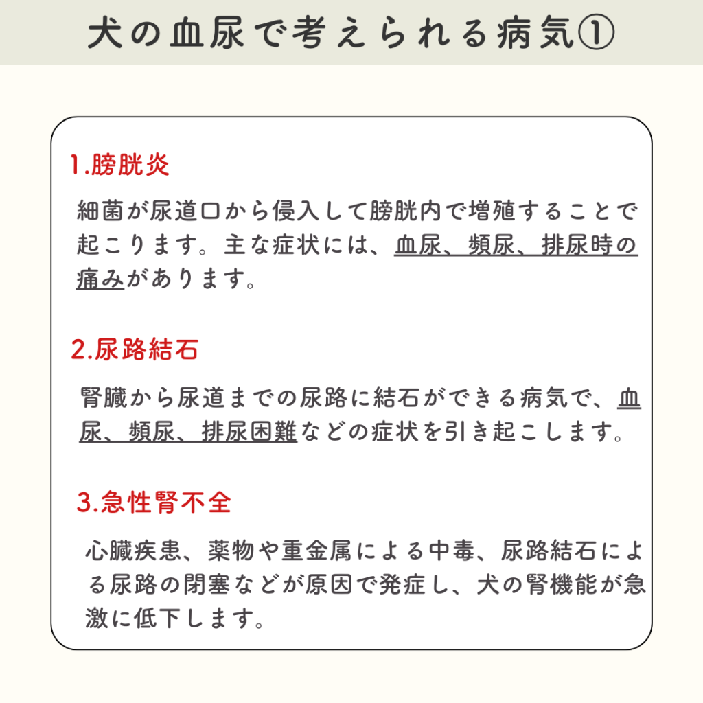 メス犬の場合は、膣炎や子宮蓄膿症、子宮内膜炎などが考えられます。細菌感染を起こすことや、陰部からの出血が尿に混じって血尿と見間違える場合もあります。