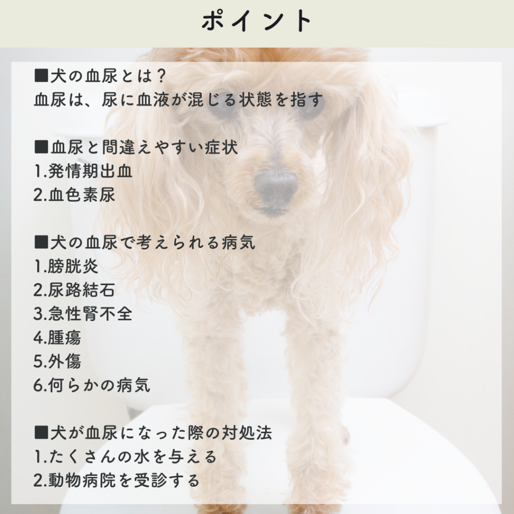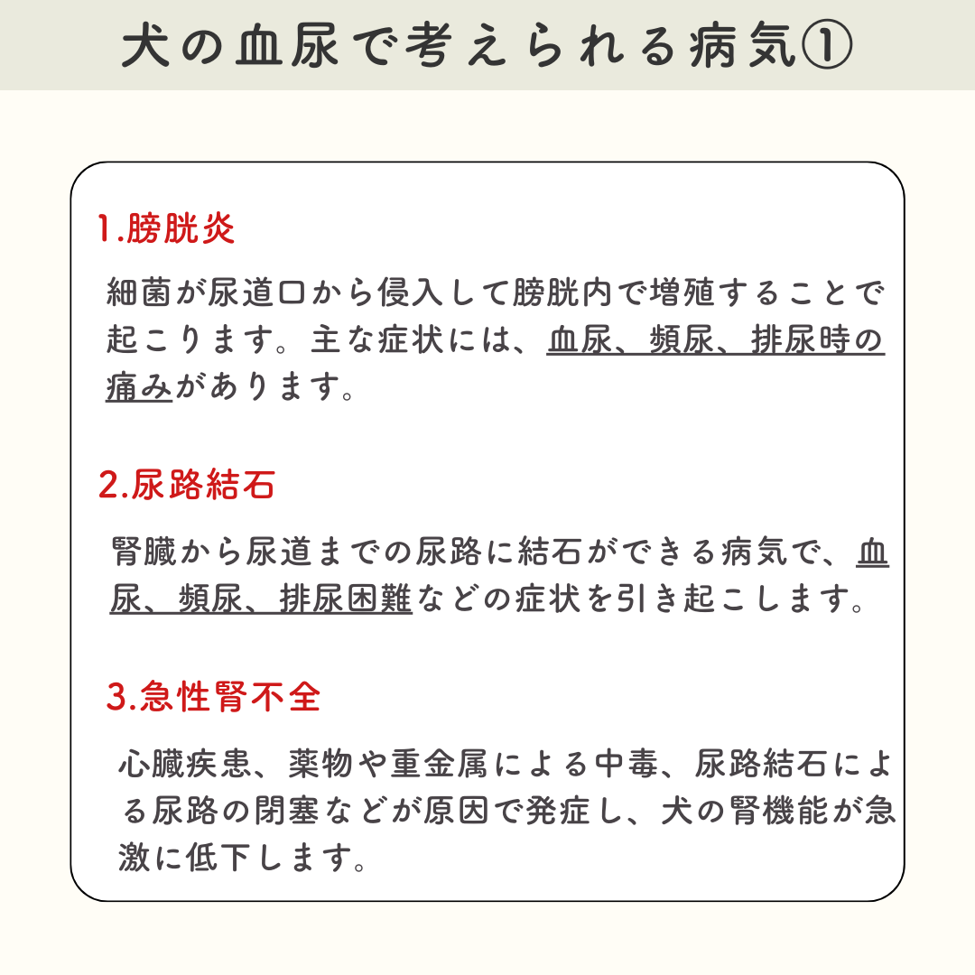 犬の血尿は、発情期のメス犬を除いて、膀胱炎、膀胱腫瘍、急性腎不全など、命に関わる病気が隠れている可能性があります。血尿は重篤な病気の兆候である可能性があるため、疑わしい症状を見つけたらすぐに獣医師の診察を受けることが重要です。