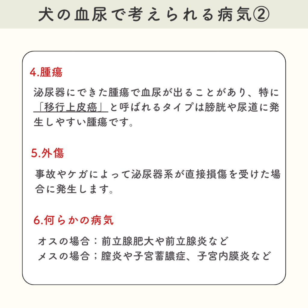 例えばオス犬の場合、前立腺肥大や前立腺炎などが考えられます。膀胱の真下に前立腺があるため、肥大した前立腺が尿道を狭くしてしまったり、細菌感染を起こすことで血尿が出ることがあります。