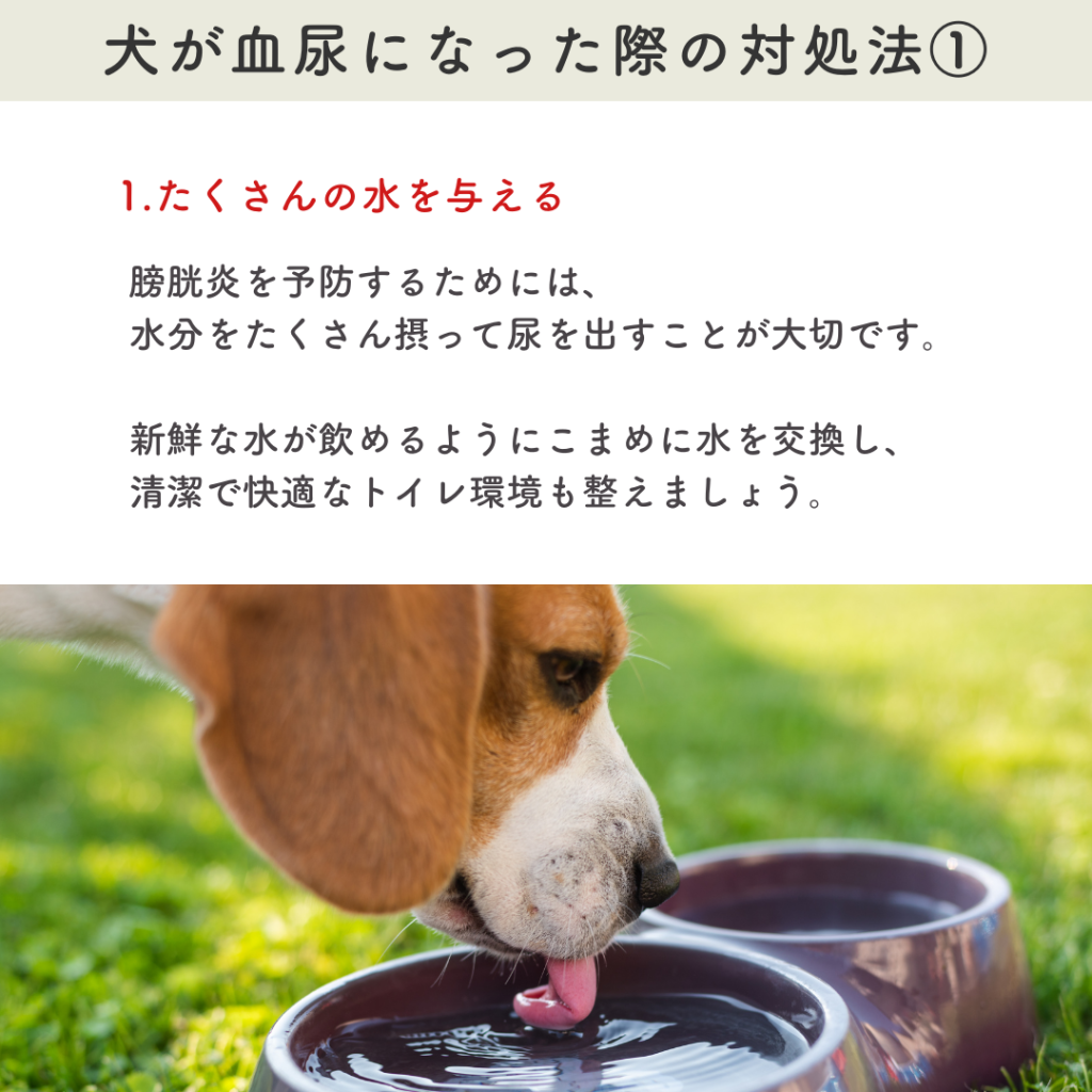 膀胱炎を予防するためには、水分をたくさん摂って、尿として出すことが大切です。いつでも新鮮な水が飲めるように、こまめに水を交換しましょう。水に味付けすると、大量摂取につながり、水中毒のリスクがあるため注意が必要です。