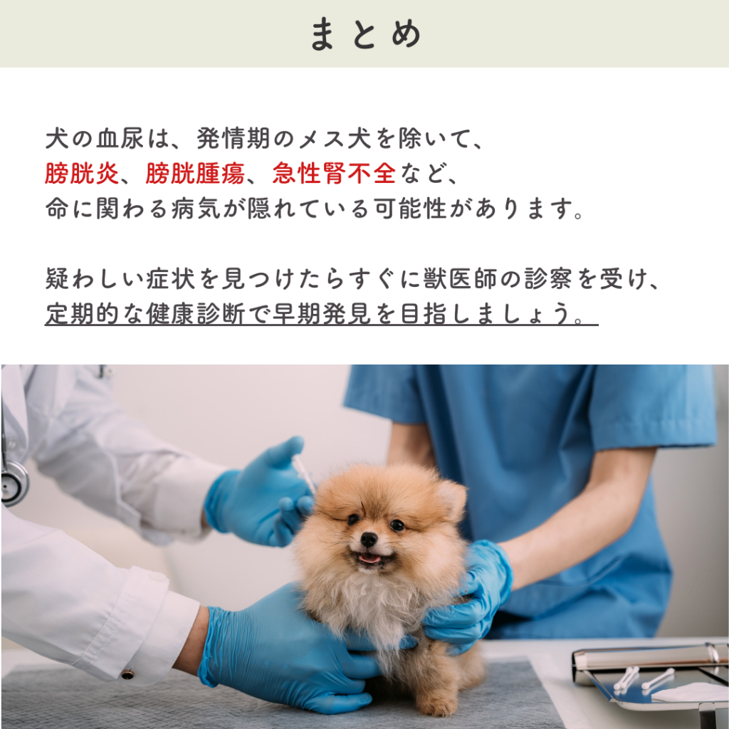 そのため、血尿が確認されたら、症状が一時的に落ち着いたとしても、獣医師の適切な診断と治療を受けることをおすすめします。