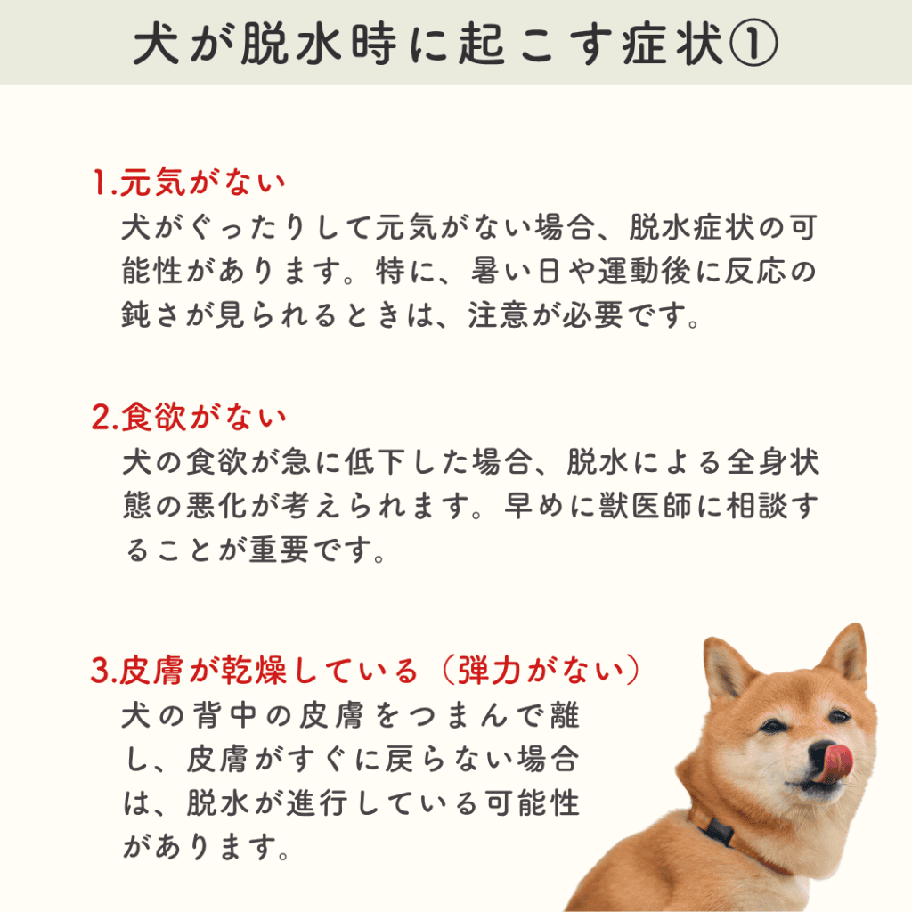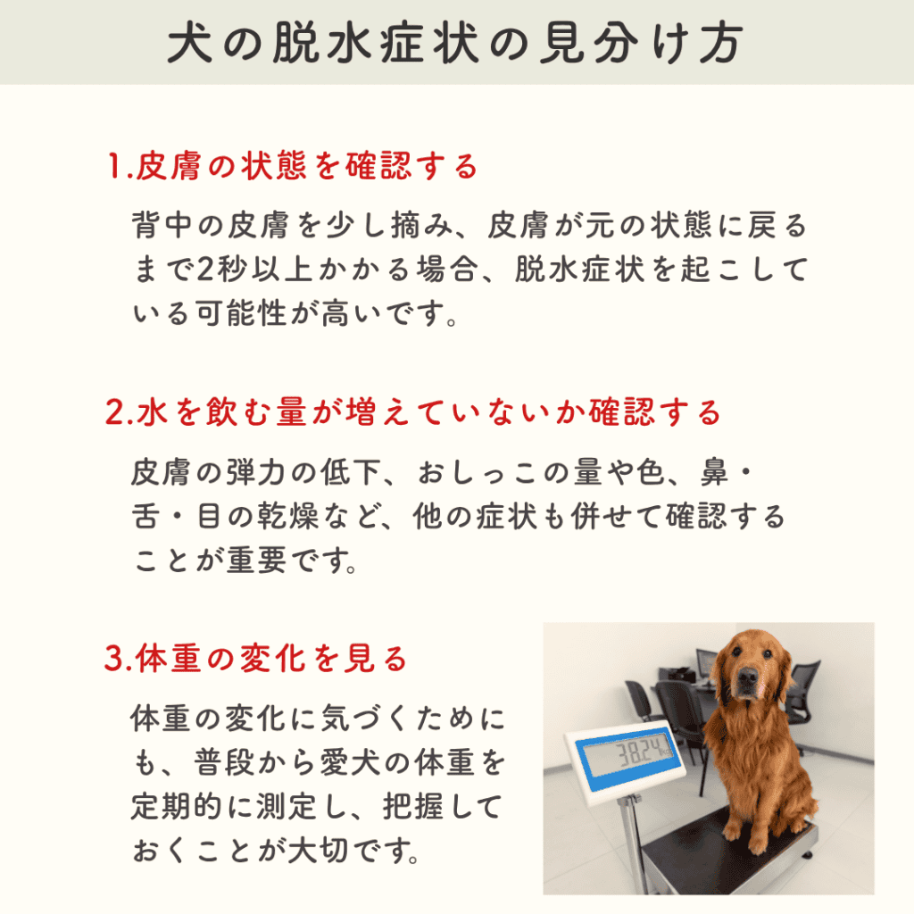 こうした兆候が見られた場合、皮膚つまみ試験といって、皮膚の弾力性を確認する試験があります。背中の皮膚を少し摘んで確認して下さい。摘んだ皮膚が元の状態に戻るまで2秒以上かかる場合、脱水症状を起こしている可能性が高いです。