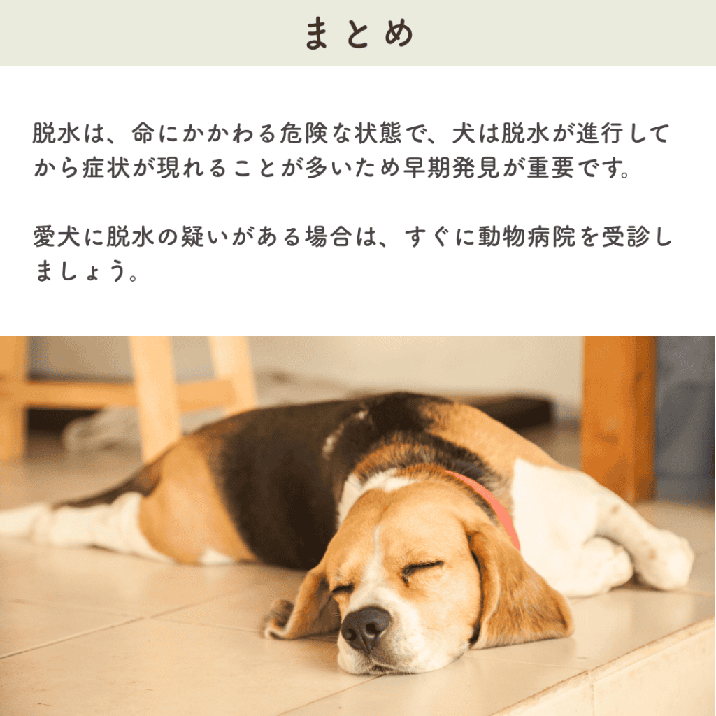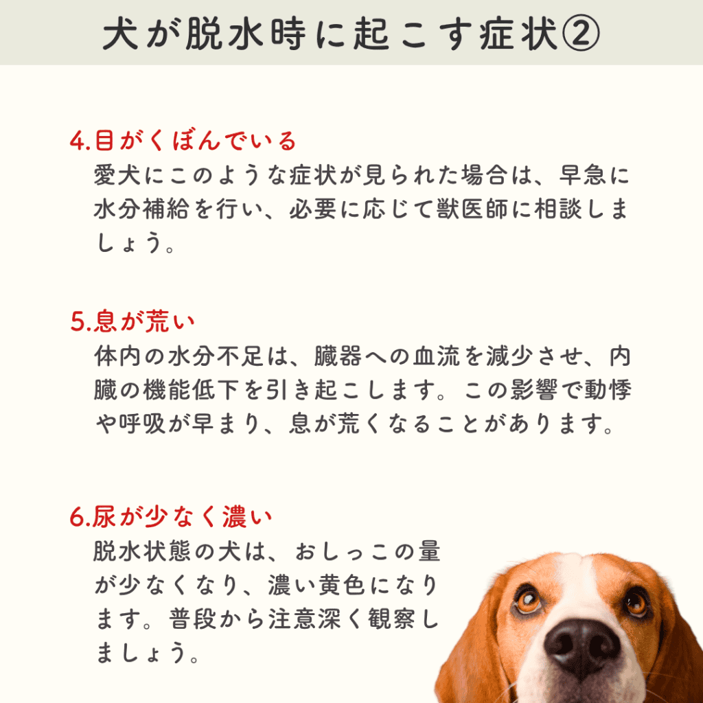 また、犬が「ハァハァ」と呼吸するパンティングも、体温を下げるために、常に体内の水分を蒸発させています。この水分喪失が、水分摂取を上回った時に、脱水は進行します。