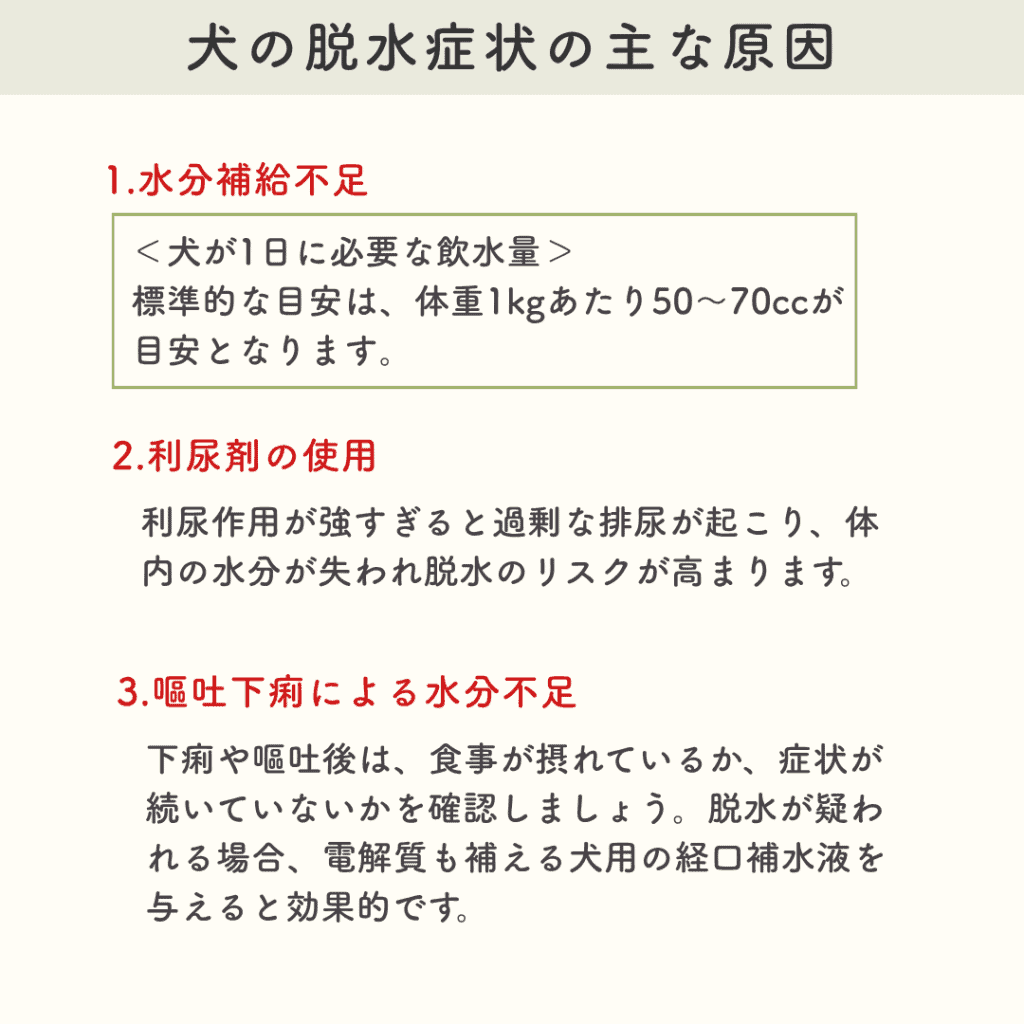 愛犬を脱水から守り、適切に対処するには、まず、なぜ脱水が起こるのか原因を知ることが大切です。ここでは、犬が脱水症状になる主な原因を解説します。