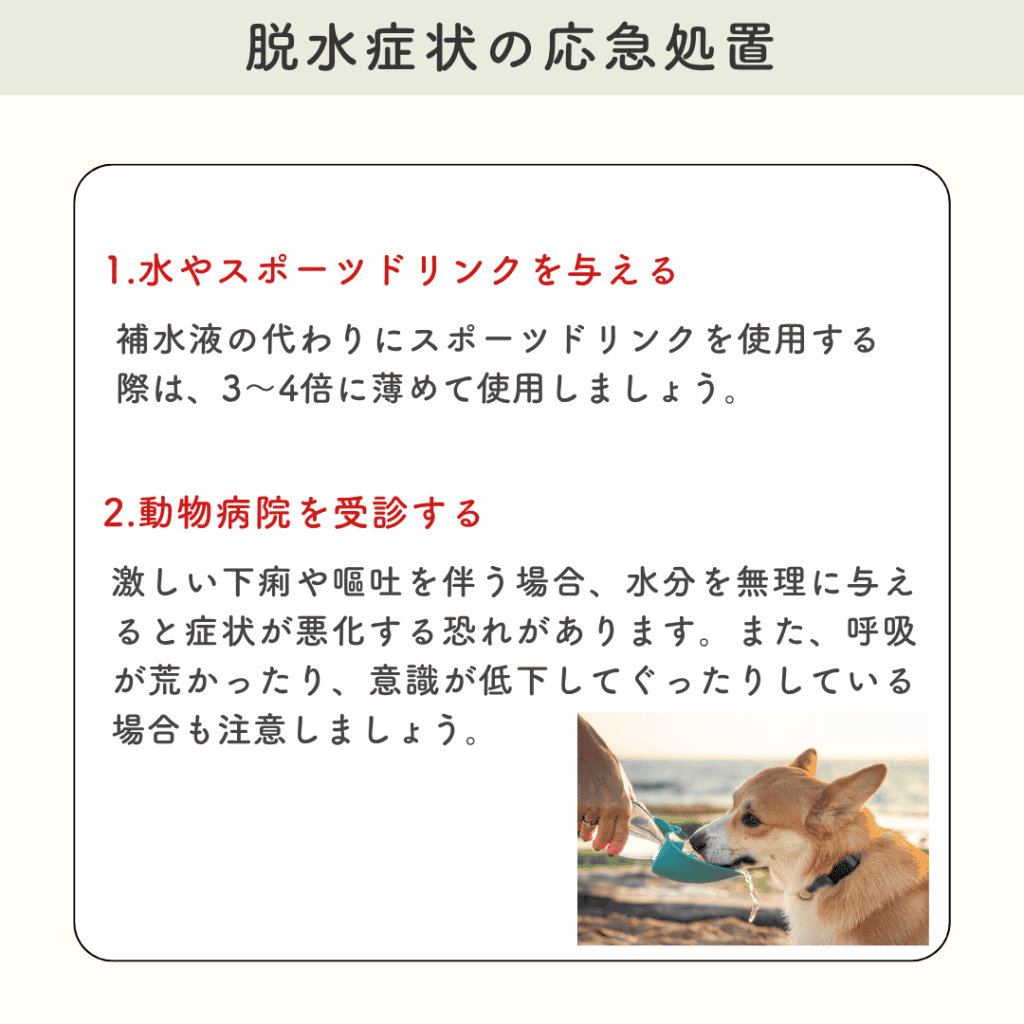 犬が脱水症状を起こした場合、自宅での応急処置として電解質を含む動物用経口補水液を与えることが効果的です。犬が自力で飲めない場合は、スポイトを使い、少しずつ口に入れて与えます。
