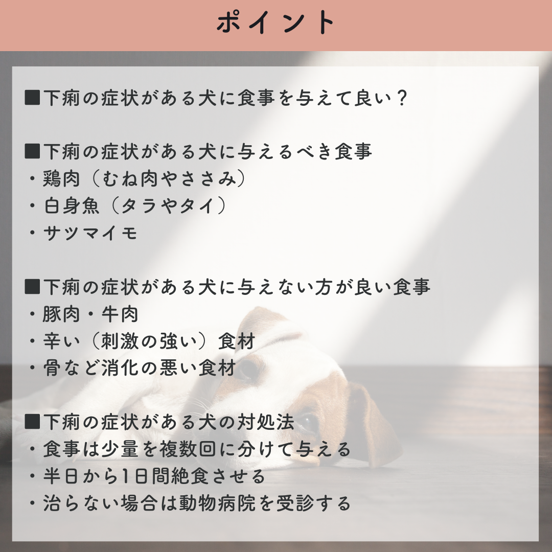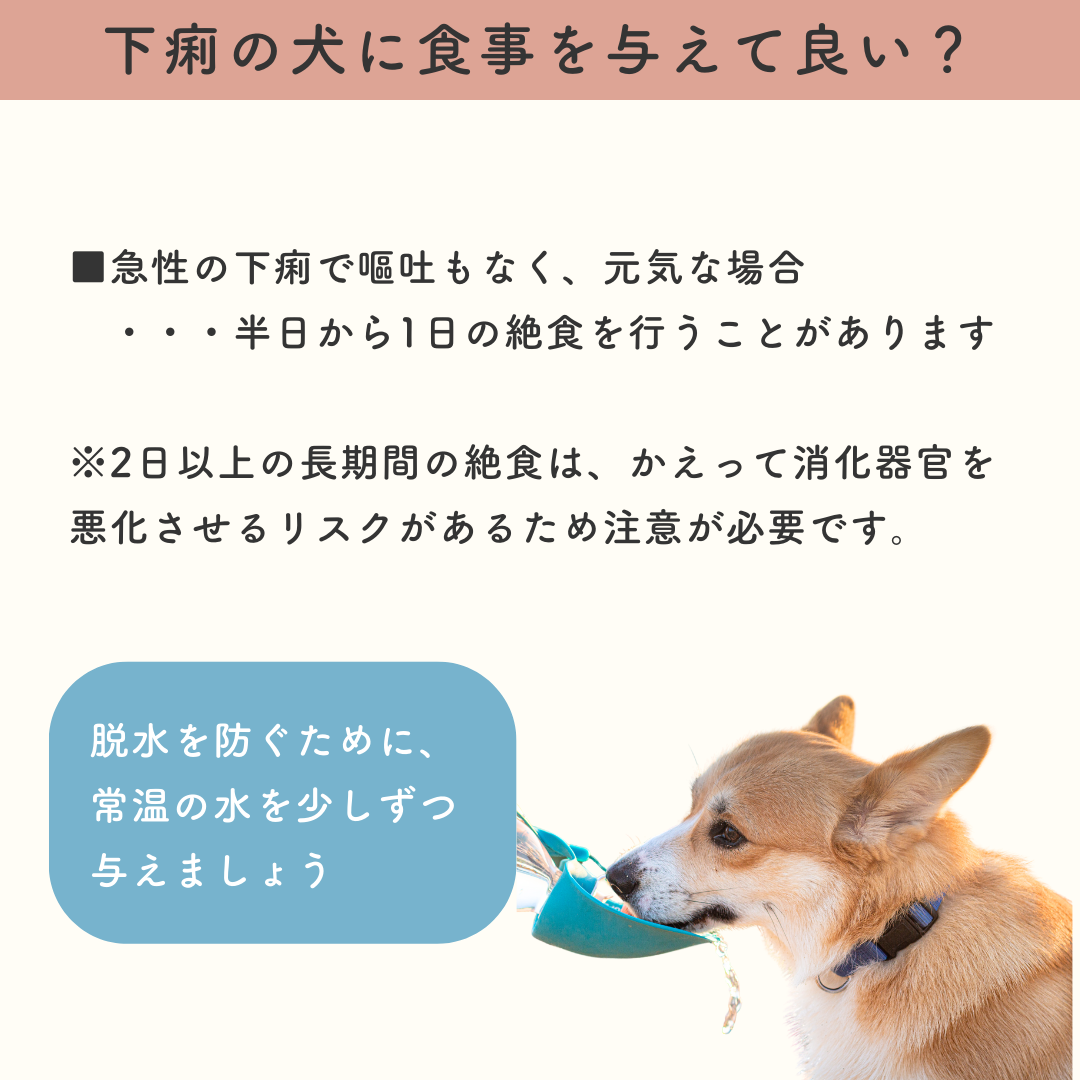 半日〜1日ほど食事を抜き、胃腸を休ませて様子を見ましょう。詳しくは後述の「犬が下痢になってしまった時の対処法」を参考にしてください。