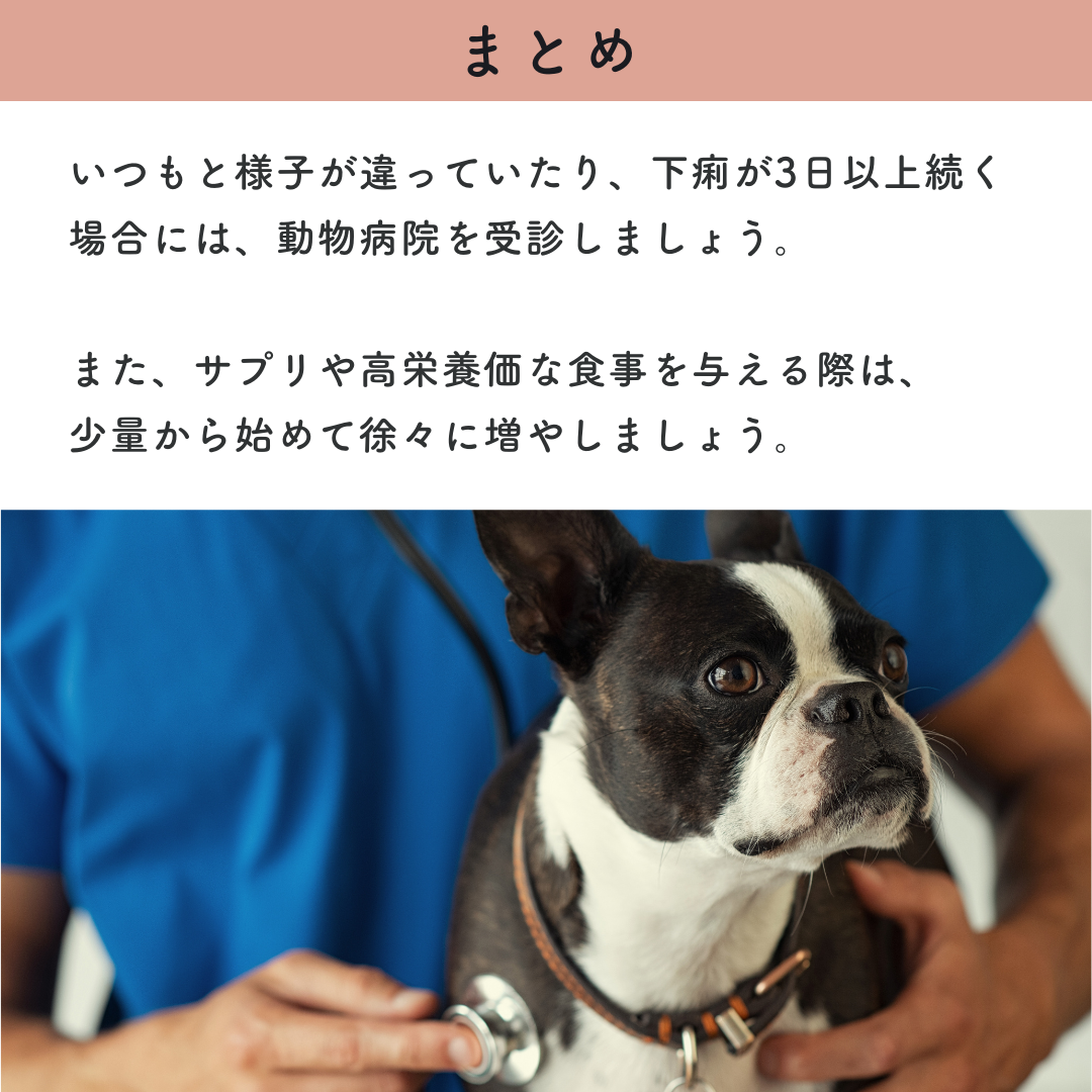 また、日頃から腸内環境を整えるサプリメントを試したり、愛犬に合った消化の良いフードを選んだりすることも、下痢になりにくい丈夫なお腹を育てる上で有効です。