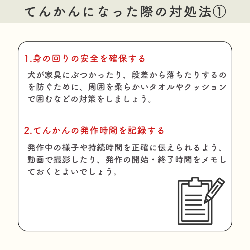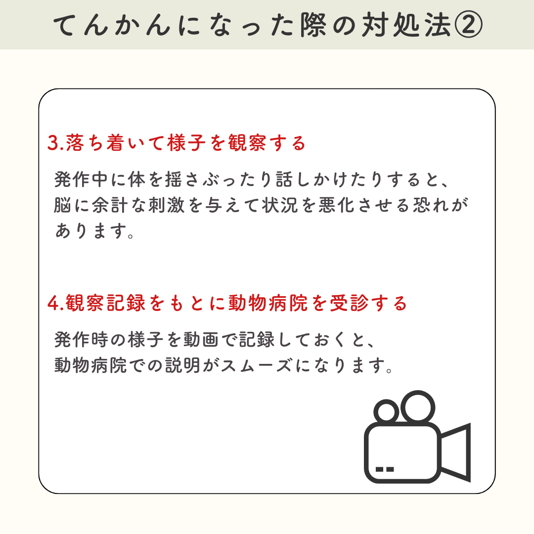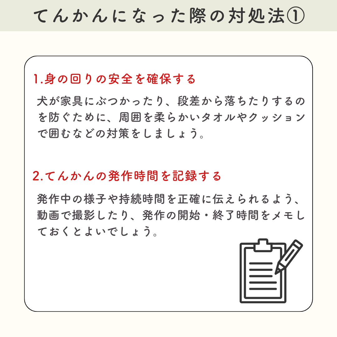 発作が起きた際には、周囲の環境を迅速かつ安全に整え、特に発作が5分以上続く、連続して発作が起きる、1日に2回以上発生する場合はすぐに動物病院に相談しましょう。