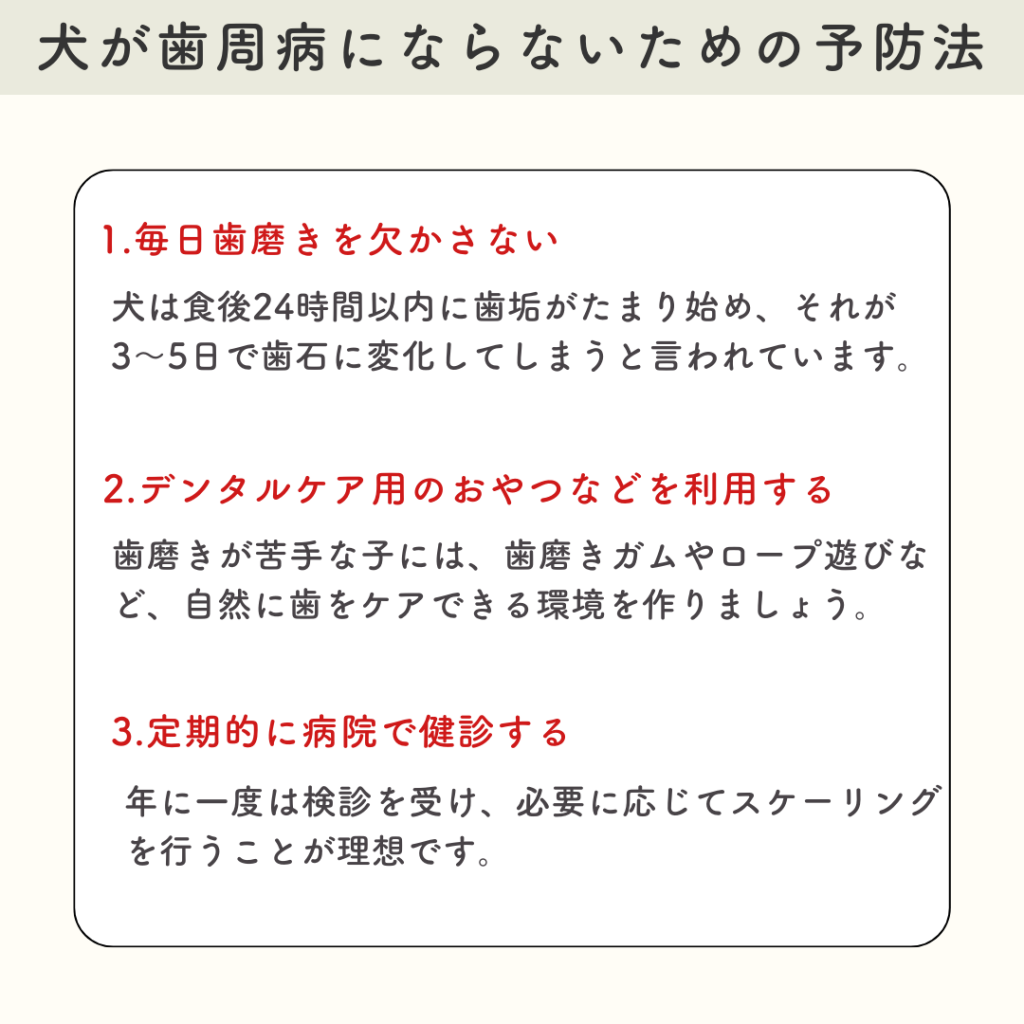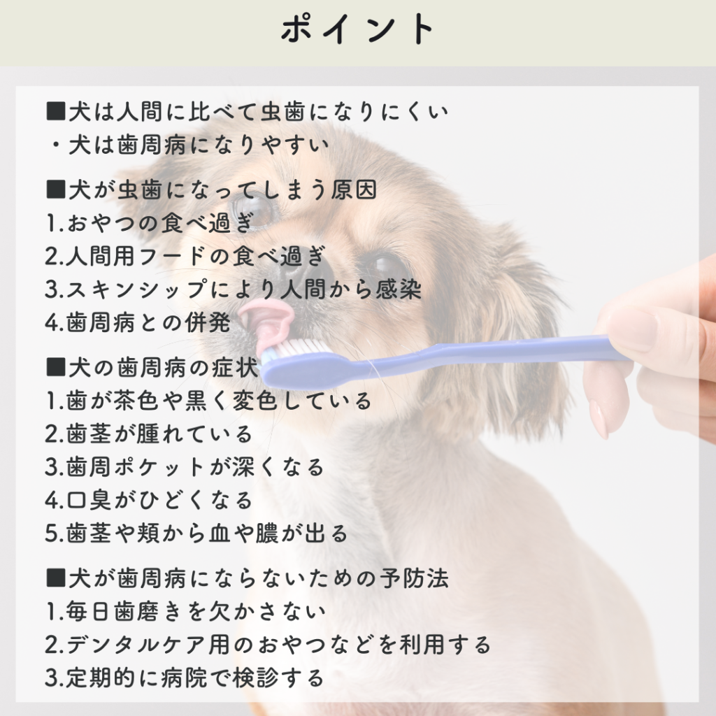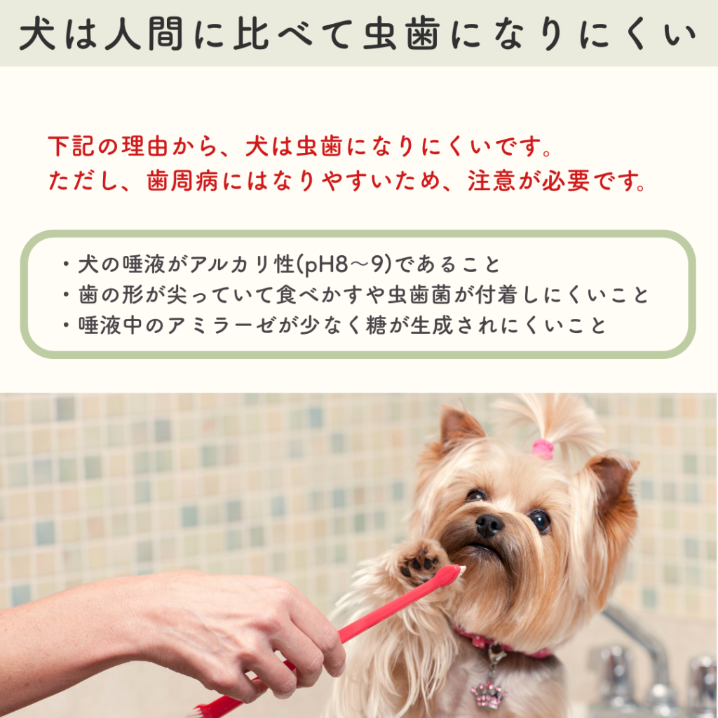 ただし、犬は虫歯になりにくいのですが、歯周病にはなりやすいため、注意が必要です。