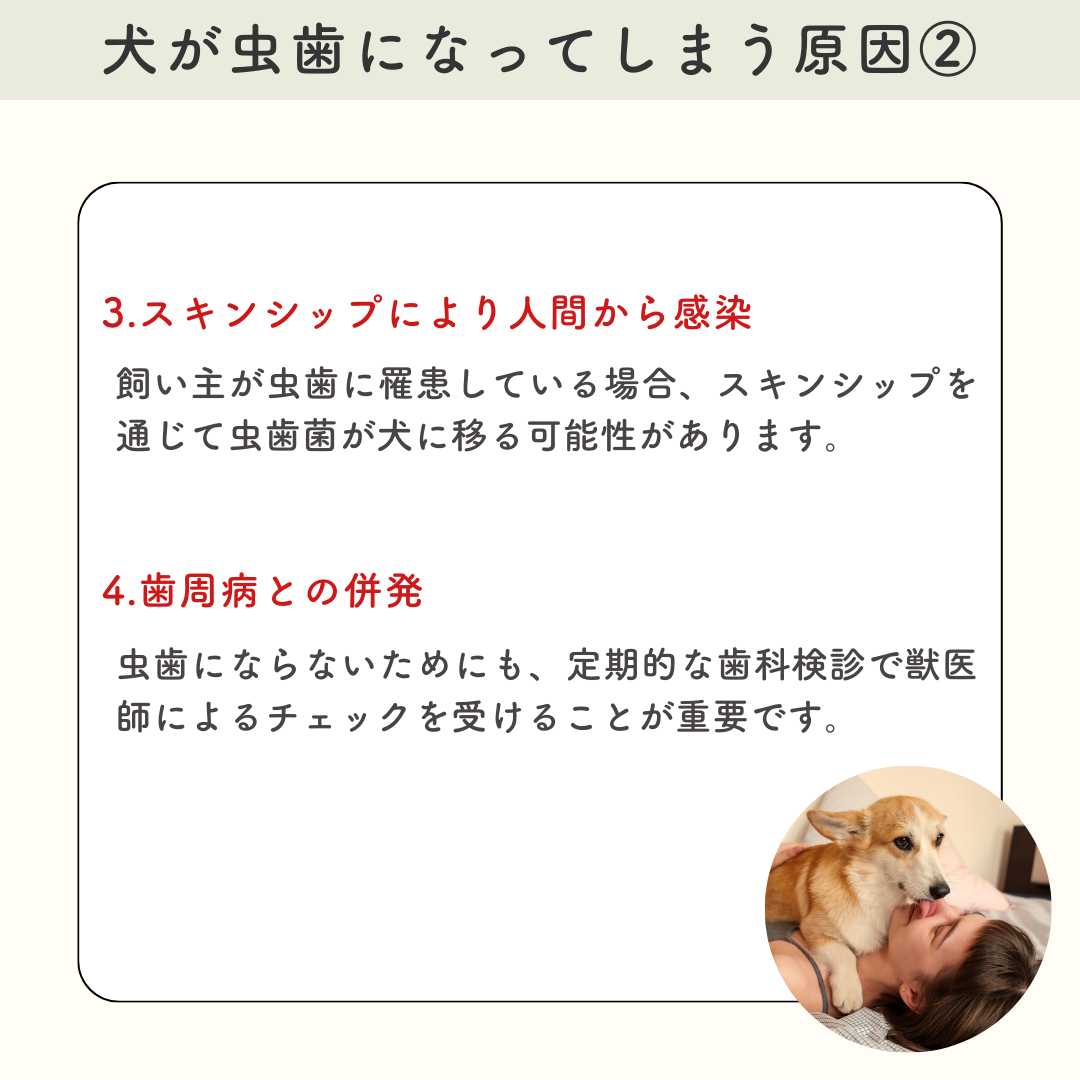犬との過剰なスキンシップ、特に顔や口を舐めさせたり、共有した食べ物を与える行為には注意が必要です。飼い主が虫歯に罹患している場合、このような接触を通じて虫歯菌が犬に移る可能性があります。