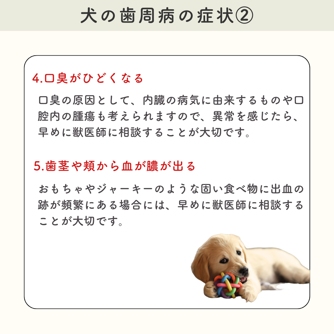 犬は、本来口臭が少ない動物ですが、口臭が感じられる場合は、歯周病の可能性があります。食べかすから歯垢が作られ、細菌が増殖することで口臭が発生しますが、歯周病の進行によってさらに口臭が酷くなります。