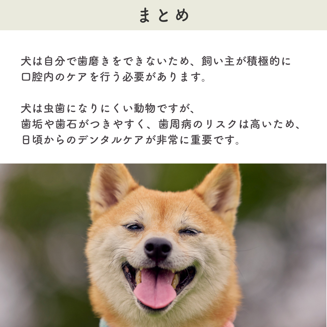 犬は虫歯になりにくい動物ですが、歯垢や歯石はつきやすく、歯周病のリスクは高いため、日頃からのデンタルケアが非常に重要です。定期的な歯磨きや獣医師によるチェックを通じて、愛犬の口腔環境を守っていきましょう。